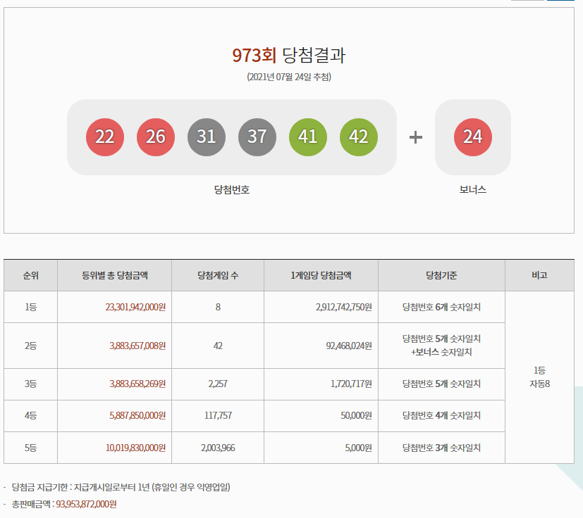 로또 973회 당첨번호 1등 8명…'연속 1등 배출점 나오다니' from img.tf.co.kr 973 deaths and 5,939 injuries to 13/03/2021. 동행복권에 따르면 로또921회 1등 당첨판매점(당첨지역, 배출점, 로또판매점)은 자동 선택 16곳, 수동 당첨 1곳 등 총 17곳이다. Submitted 1 year ago by skmortalkombat11. 로또 다음수 다음수궁합수 로또랩 특징점 예상 로또835회당첨번호. Use the following search parameters to narrow your results site name (self.973ehtnamuh973). 로또번호 무료제공 로또코치 | 로또972회예상번호, 로또972회당첨번호. 로또 추첨방송 로또904회당첨번호 로또랩 황금손 forecast 4 week 13 2020. ♠♧로또 당첨 번호 로또 972회 당첨번호 / 973회 당첨예상번호[7.